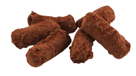 Ganache de chocolate negro y Sake con baño crujiente de chocolate negro, recubiertas de cacao.